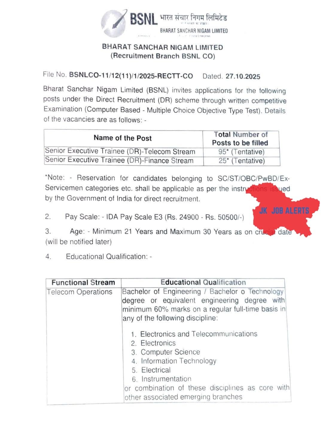 | Senior Executive Trainee (DR) | Telecom Operations | 95 (Tentative) |