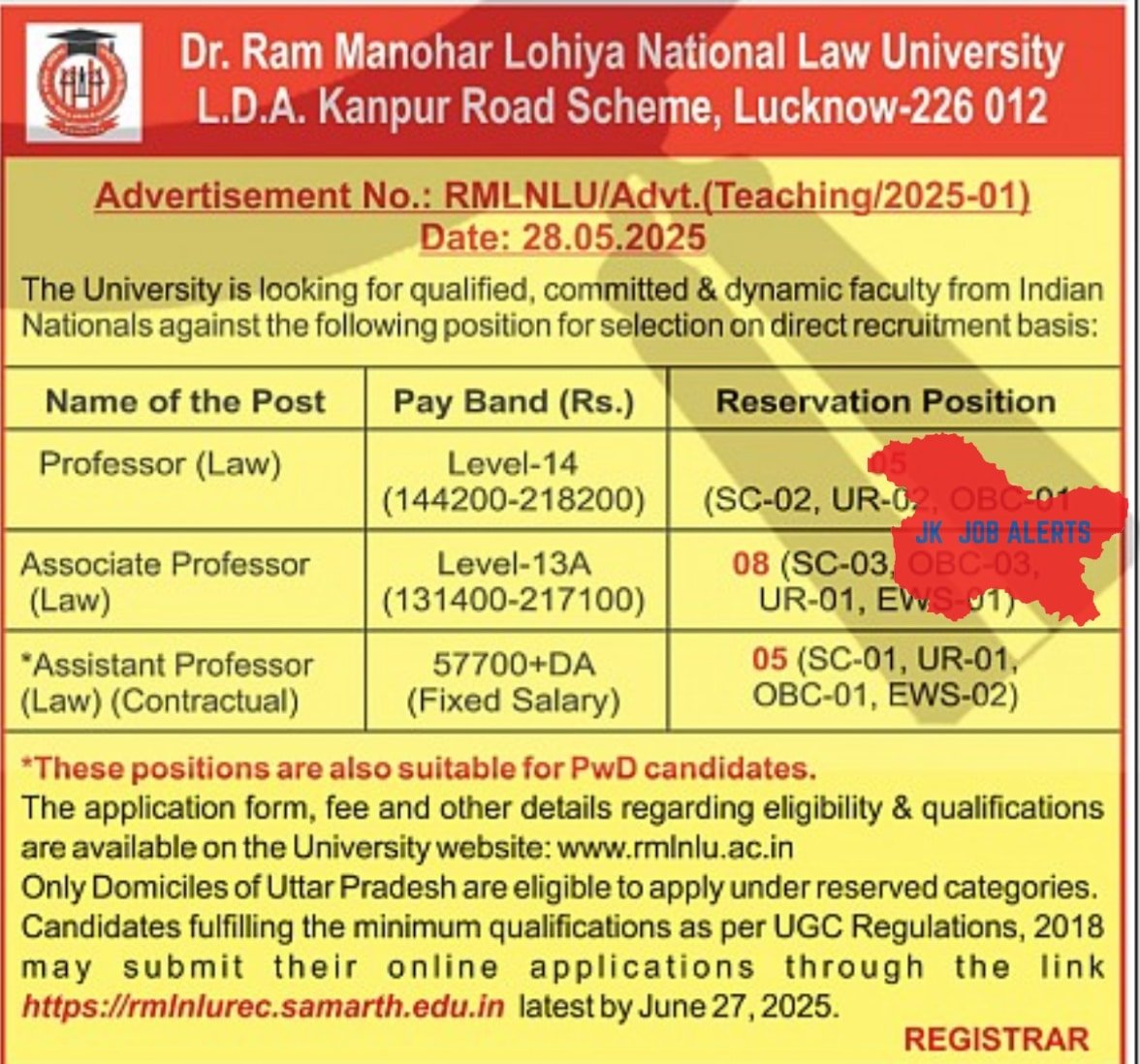 Dr. Ram Manohar Lohiya National Law University, located on L.D.A. Kanpur Road, Lucknow – 226012, is inviting applications from qualified, committed, and dynamic Indian nationals for teaching positions on a direct recruitment basis. Note: Only domiciles of Uttar Pradesh are eligible to apply under reserved categories.