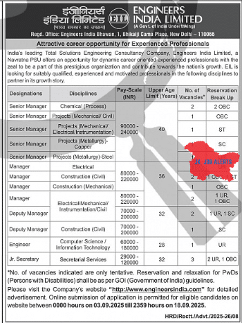 | Senior Manager | Projects (Electrical/Instrumentation) | ₹80,000–2,20,000 | 40 years | UR |