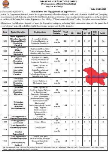 - Registration: Apply online through the official IOCL apprenticeship page. Where required, register on National Apprenticeship portals: