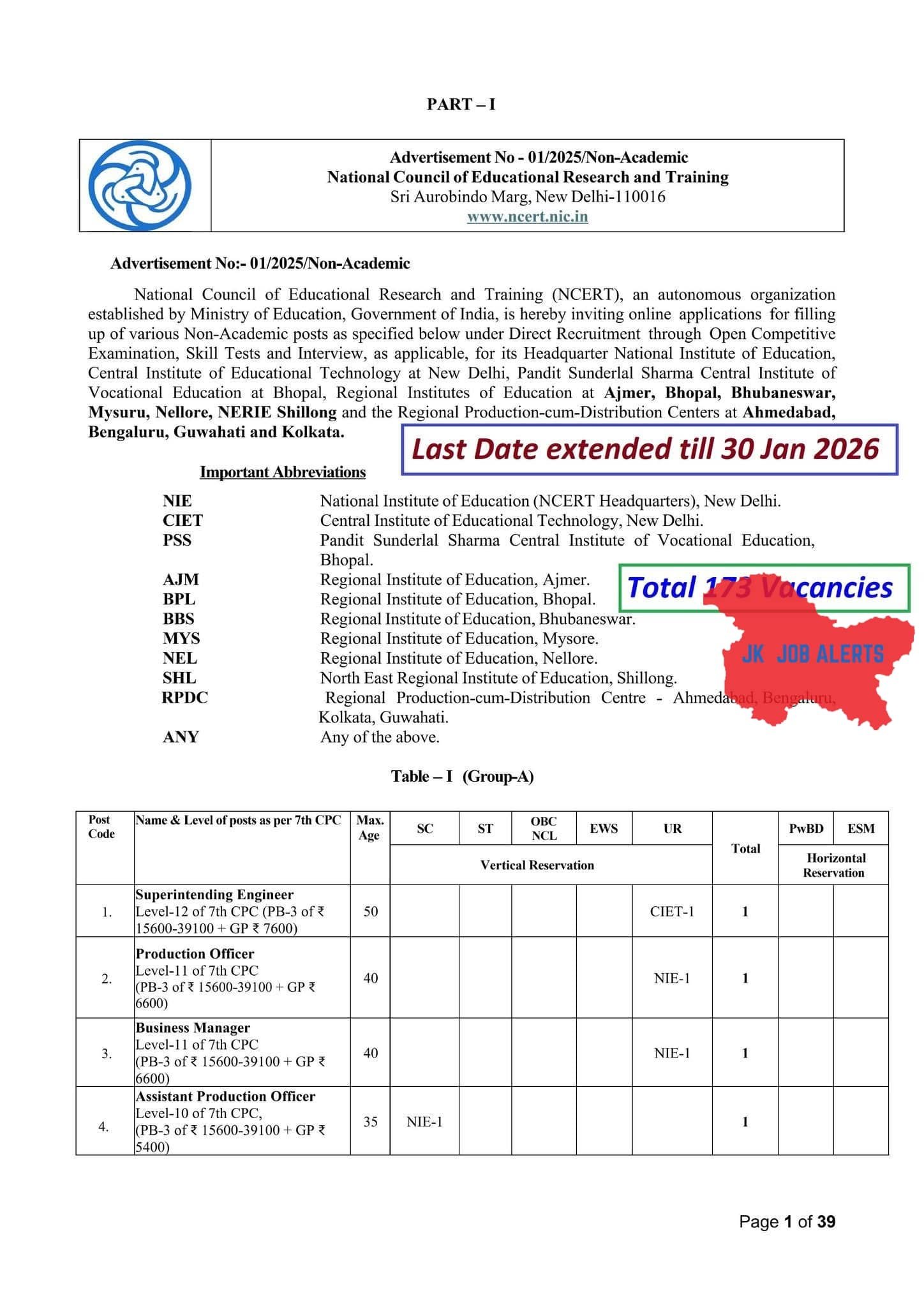 NCERT Recruitment 2025 – Apply online for 173 Non-Academic posts including Engineer, Production Officer, Business Manager, and Assistant Production Officer. Last date extended till 30 January 2026.