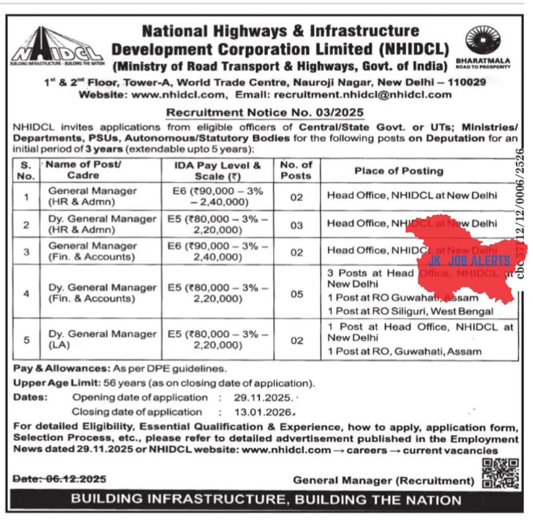 - Qualification & Experience: As per detailed advertisement (refer Employment News dated 29.11.2025 or NHIDCL website).