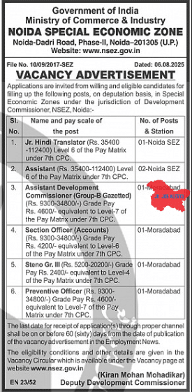 Advertisement Date: 06 August 2025 | File No.: 10/09/2017-SEZ