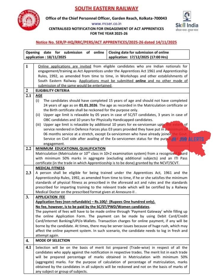 Notice No.: SER/P-HQ/RRC/PERS/ACT APPRENTICES/2025-26