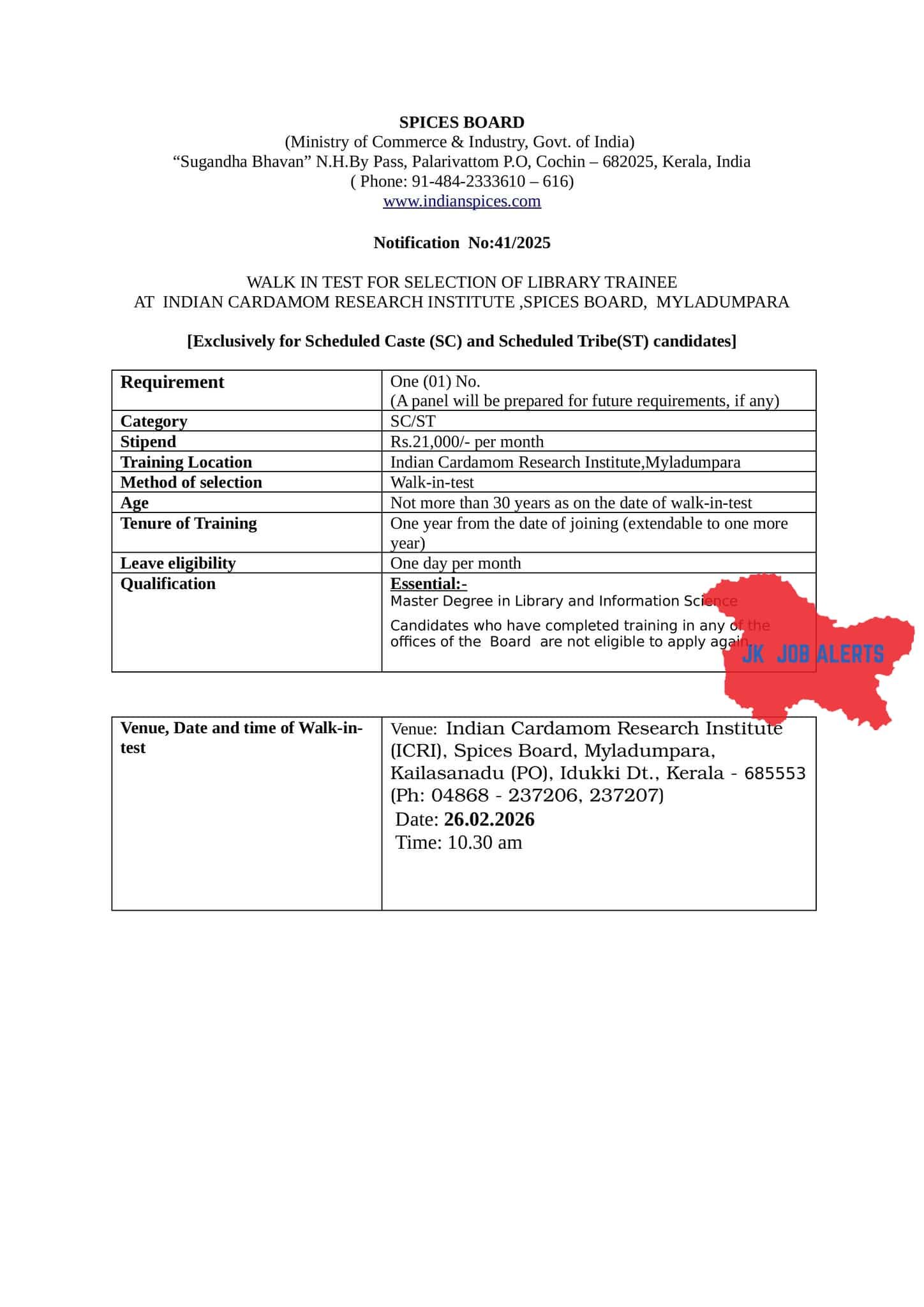 Spices Board Library Trainee Recruitment 2026 – Walk-in Test for SC/ST