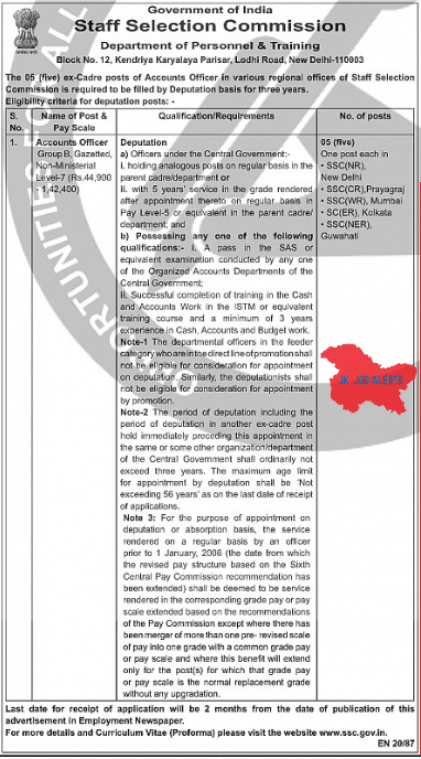The Staff Selection Commission (SSC) invites applications for the post of Accounts Officer on a deputation basis for a period of three years. These positions are to be filled in various regional offices of SSC.
