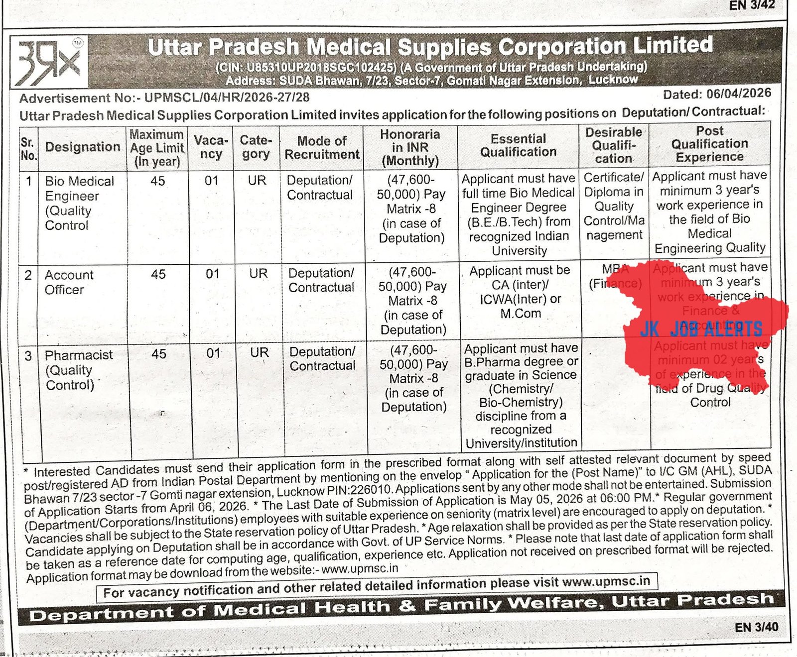 UPMSCL Recruitment 2026 – Biomedical Engineer, Accountant & Pharmacist Posts